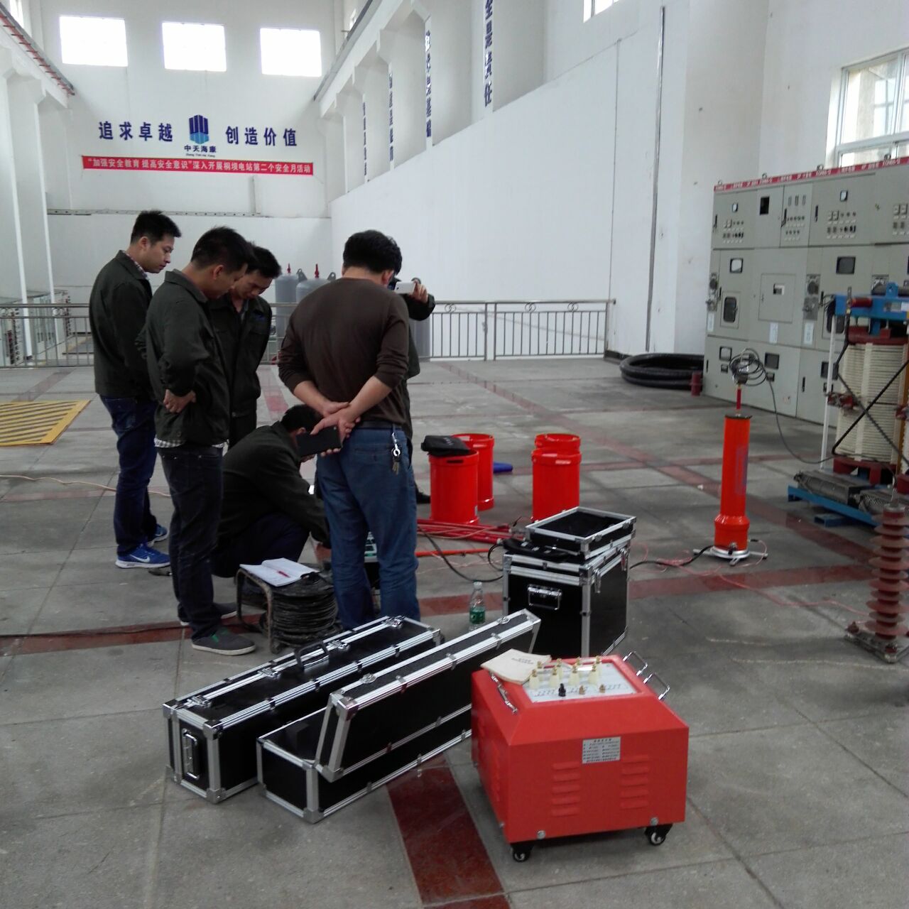 此次培訓的重點設備是YTC850-135kVA/108kV變頻串聯諧振試驗裝置。我公司的該設備為專利產品,諧振電源調頻及功率元件使用先進的日本進口的優質元器件,設計的是諧振式濾波電路,能改善輸出電壓的波形畸變,獲得很好的正弦波形,有效的防止了諧波峰值對試品的誤擊穿。變頻電源保護功能強,穩定性好;具備具備全自動(自動調諧、自動升壓)、全手動(手動調諧、手動升壓)以及半自動(自動調諧、手動升壓及手動調諧、自動升壓)的多種工作模式,可任意切換使用;操作方便;大屏幕觸摸LED液晶彩屏和外接鼠標直接完成各種參數的設置,試驗結果可保存、打印、上傳、回查等。