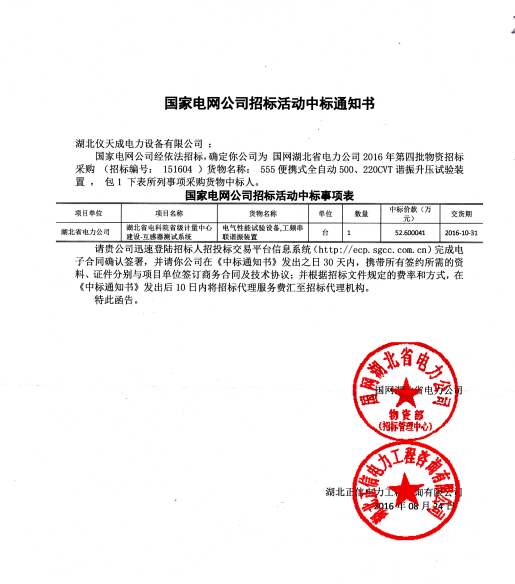 國(guó)家電網(wǎng)公司招標(biāo)--湖北儀天成中標(biāo)